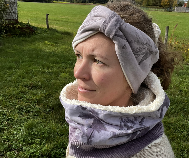 Cache oreilles réalisé à partir de tissus recyclés ou tissus en coton biologique (doublure polaire) Impressions et teintures naturelles réalisées à la main.