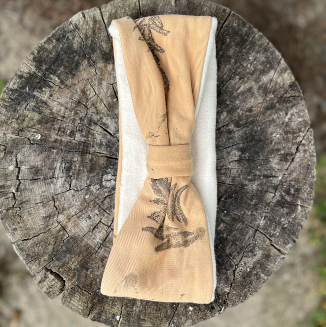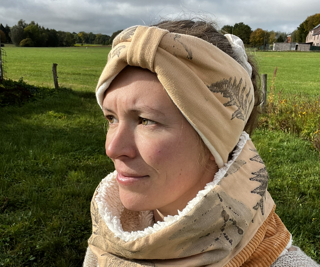 Cache oreilles réalisé à partir de tissus recyclés ou tissus en coton biologique (doublure polaire) Impressions et teintures naturelles réalisées à la main.