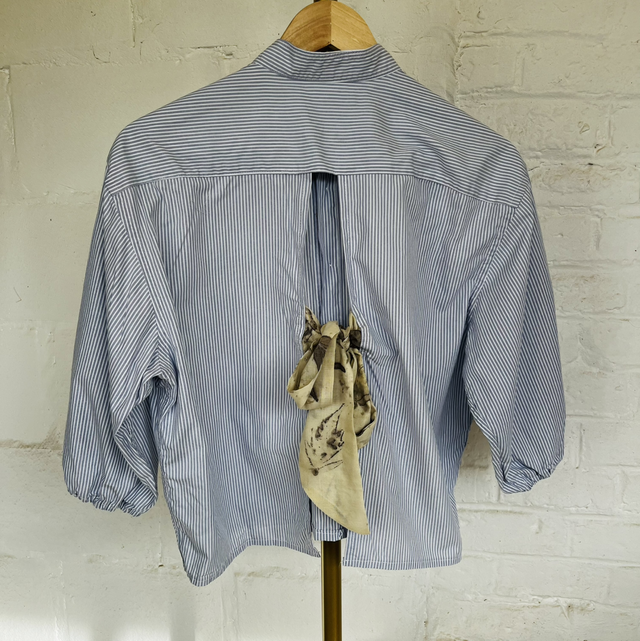 Chemise upcyclée et customisée grâce à la teinture végétale. Ouverture au dos avec noeud. Taille unique manches 3/4 élastiquées .