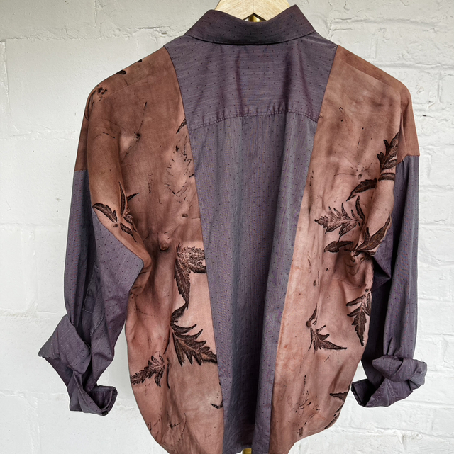 Chemise upcyclée et customisée grâce à la teinture végétale. Taille unique. Manches longues