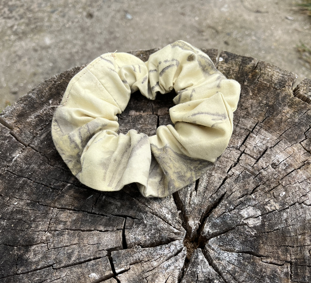 Chouchou réalisé à partir de tissus recyclés et teints naturellement à la main.