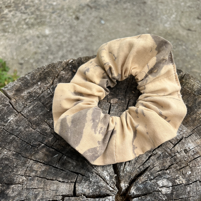 Chouchou réalisé à partir de tissus recyclés et teints naturellement à la main.