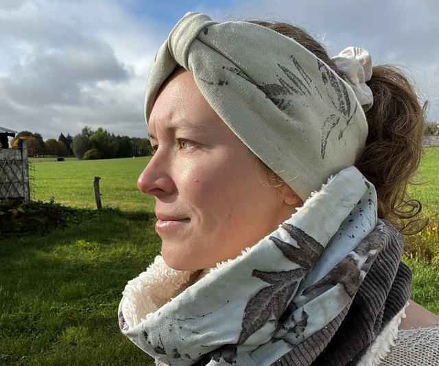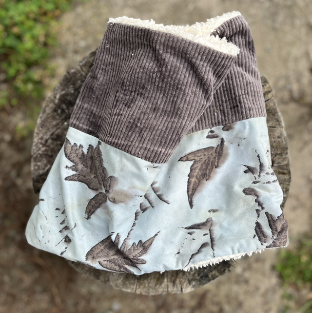 Tour de cou réalisé à partir de tissus recyclés ou tissus en coton biologique (velour et fourrure) Impressions et teintures naturelles réalisées à la main.