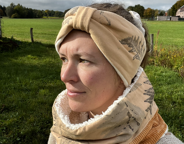 Tour de cou réalisé à partir de tissus recyclés ou tissus en coton biologique (velour et fourrure) Impressions et teintures naturelles réalisées à la main.