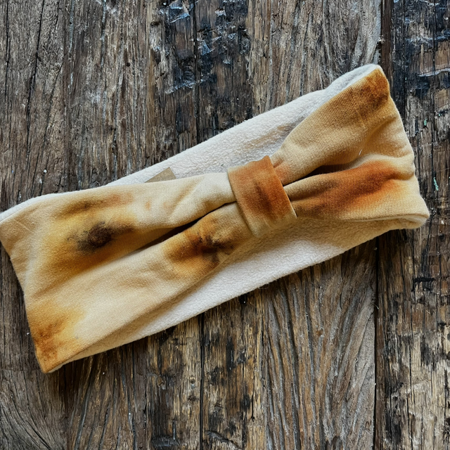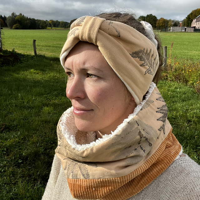Cache oreilles réalisé à partir de tissus recyclés ou tissus en coton biologique (doublure polaire) Impressions et teintures naturelles réalisées à la main.