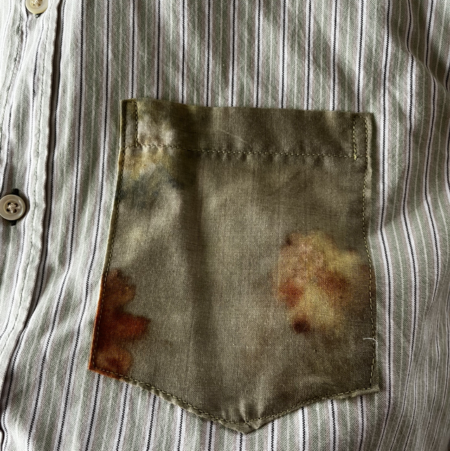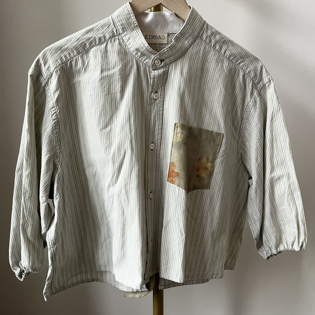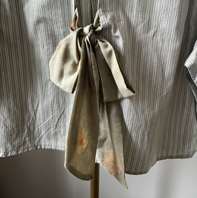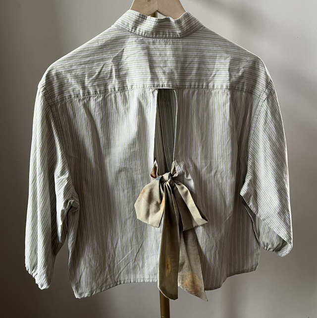 Chemise upcyclée et customisée grâce à la teinture végétale. Ouverture au dos avec noeud. Taille unique manches 3/4 élastiquées.